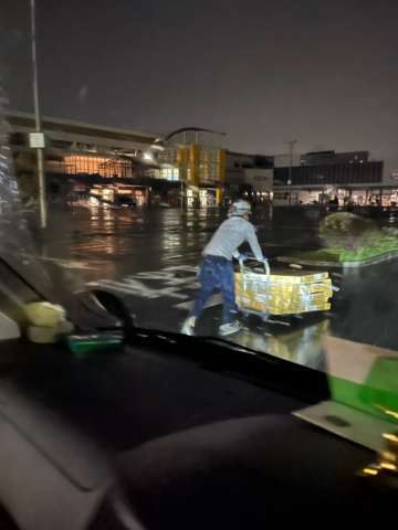 イオンモールの工事でポンプダウンして外した室外機を集めて、大雨の日にフロンガス回収作業をした様子です。 有資格者による確実な作業で法定作業…